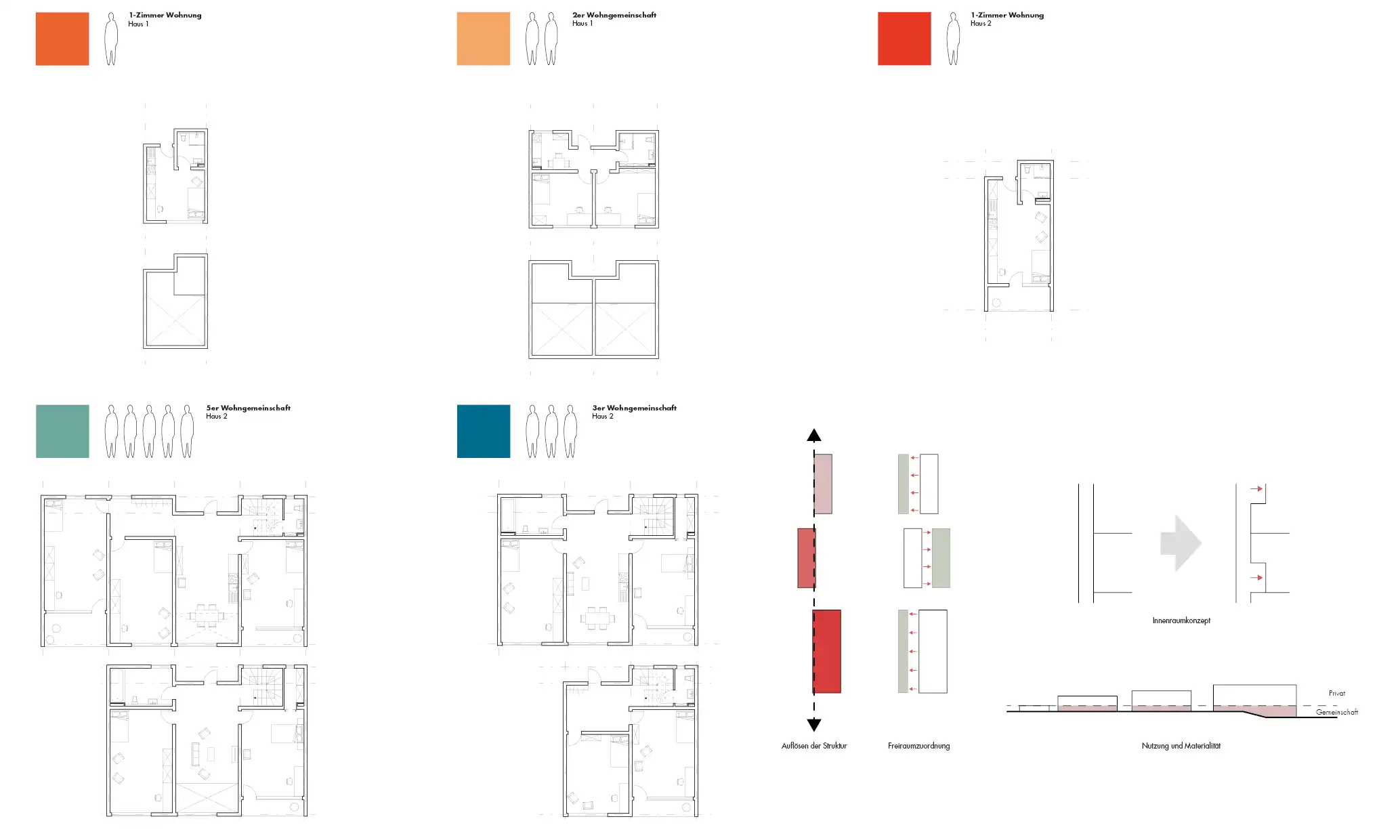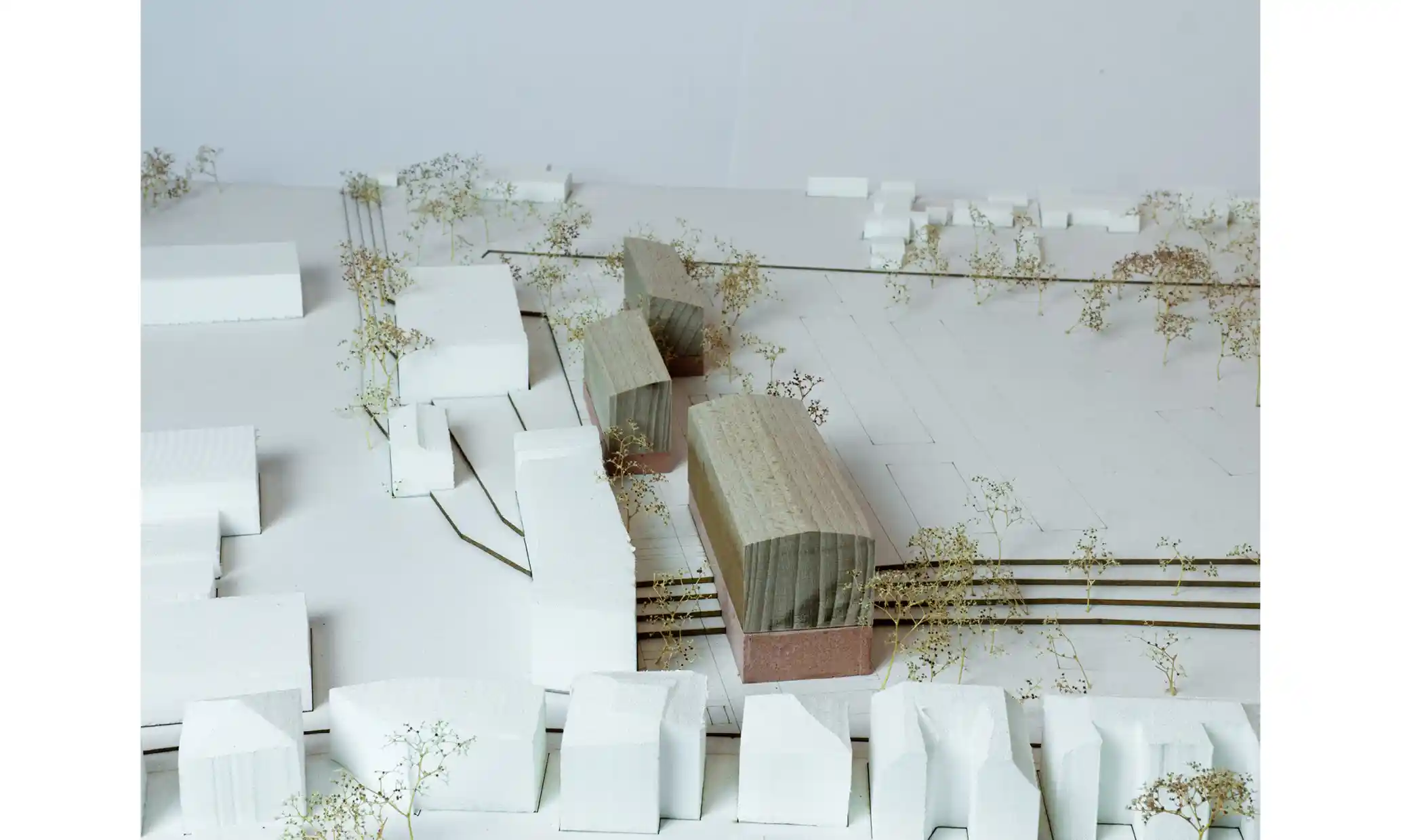 Das recht langgestreckte rechteckige Grundstück war die Grundlage der Gebäudeentwicklung. Ein zentral laufender Weg verbindet die Ludwigstraße mit dem Sackweg. In diesen Weg verschneiden sich die Baukörper und verspringen jeweils nach links und rechts. Dadurch entsteht immer eine Bezugsfläche im EG die den gemeinschaftlich genutzten Innenraum um eine Freiraumqualität erweitert. Die Nutzung lässt sich klar an der Materialität ablesen. So sind die gemeinschaftlich genutzten Flächen aus Backstein und die Wohnflächen aus Holz ausgearbeitet. In Richtung Norden löst sich die Struktur auf, indem das erste Haus als Höchstes und zweispanniges Gebäude geplant ist. Die anderen beiden sind niedriger und Einspänner mit einem Laubengang Richtung Freiraum. Das grozügig gestaltete Atrium im Haus 1 bietet eine hohe Qualtät in kalten Zeiten. Es dient als Raum der Begegnung für die Studenten. Das Projekt entstand in Zusammenarbeit mit Nele Tramp.